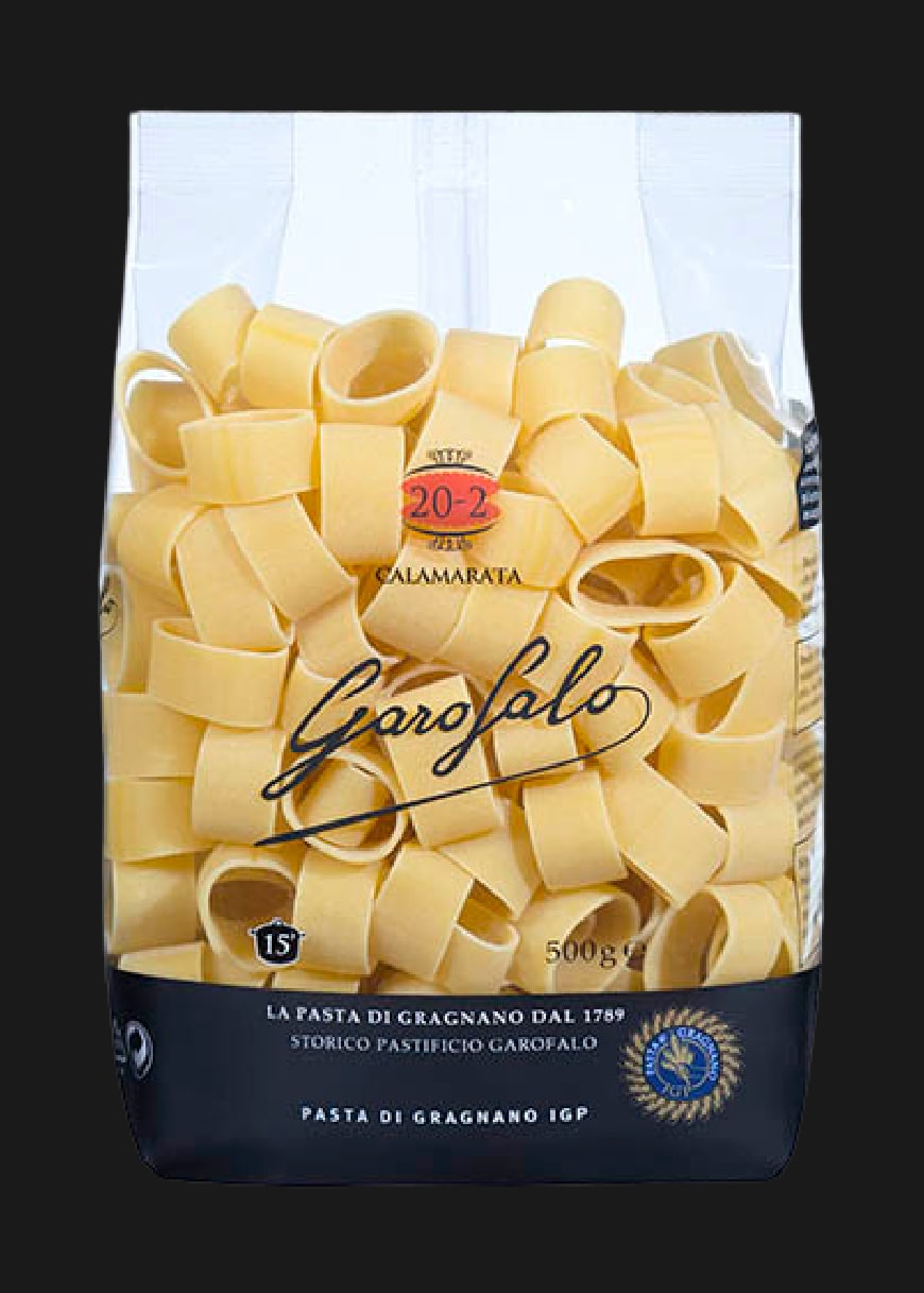 Ez a tészta különleges formájáról ismert, amely hasonlít a kalamar gyűrűjére. A Calamarata tészta tökéletes választás a tenger gyümölcsei alapú ételekhez. A tészta textúrája tökéletesen felveszi a szószokat és ízeket, így minden falatban élvezheted a friss és gazdag ízeket.